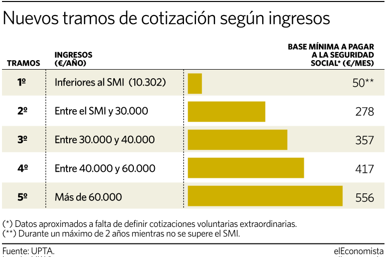 De esta forma, se pretende crear un sistema con cinco tramos de cotización para que «ningún autónomo pague por encima de sus ingresos y proporcionar el esfuerzo de aquellos que se encuentran sobrepasando el límite de una presión contributiva razonable».